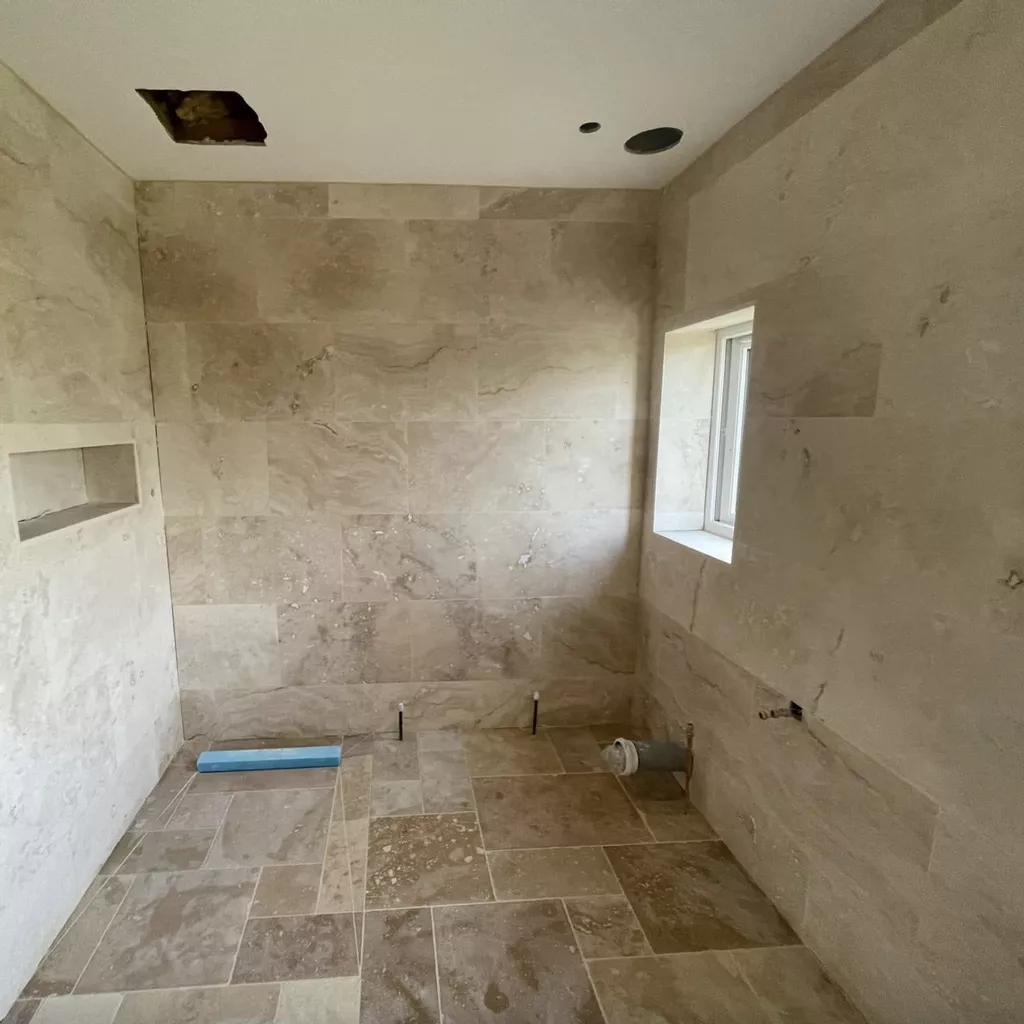 We recently completed a full bathroom renovation in Cheadle, Staffordshire, transforming the space with 38 square metres of beautiful Travertine tiles. The floor was finished in a tumbled modular Travertine for a natural, timeless look, and was first prepped with Jackoboard, including a recessed shower tray for a sleek, seamless appearance.